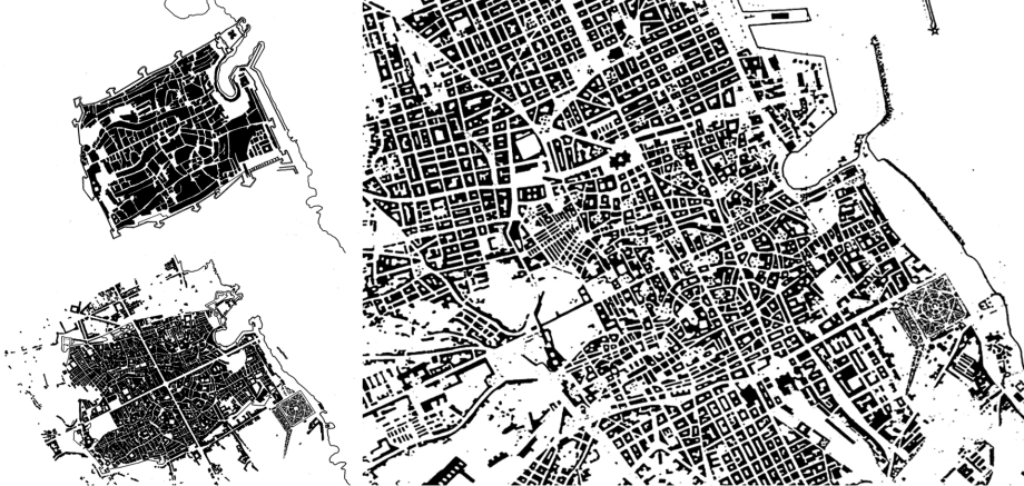 In Palermo liegen zwischen dem Plan oben links mit der Begradigung der alten, ca. 1,6 km langen arabischen Hauptstraße vom südwestlichen neuen Stadttor zum nordöstlich davon gelegenen Meer und der Vierteilung des kaum kontrollierbaren Gassengewirrs darunter ca. 250 Jahre: 1567 bis 1818. Spanier und Franzosen teilen sich diese Aufgabe nacheinander. Daneben ist die Vierteilung der Altstadt am Ende des 20. Jahrhunderts und die Expansion schachbrettartig darum angeordneter neuer Stadtviertel der sizilianischen Hauptstadt in die umliegende Bucht noch ablesbar. Mein Diplomprüfer, Prof. em. für Städtebau und Stadtbaugeschichte Peter Degen sagte auch dazu: „Palermo wurde ans Kreuz genagelt.“ 2