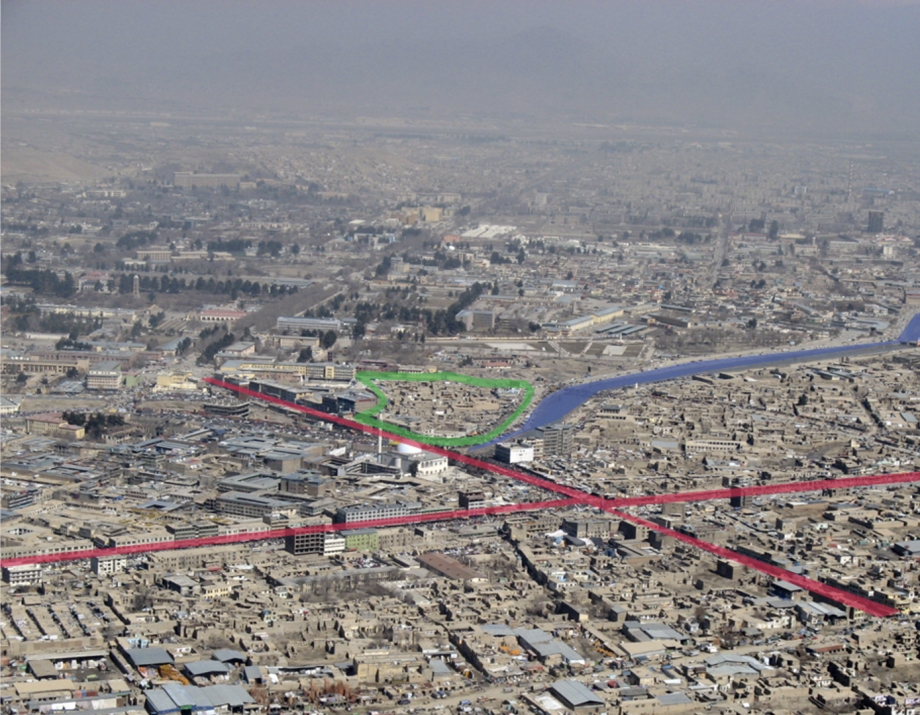 Der Blick von den alten Stadtmauern, den Orten an den Flanken des Berges hier, von denen aus insbesondere die Truppen Gulbuddin Hekmatyars im Bürgerkrieg 1991-96 Raketen auf Stellungen der Regierungstruppen Rabbanis in der Altstadt darunter feuerten, verdeutlicht nochmals die Dichte und zeigt das darin eingeschriebene, hier rot markierte Achsenkreuz. Der Kabul-Fluss ist blau markiert, grün umrandet jenes Viertel der Altstadt nördlich des Flusses, wo ich 02 / 2009 bis 07 / 2010 arbeitete.