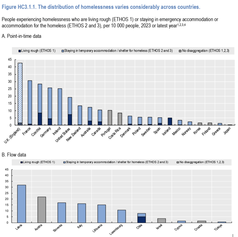 Laut OECD-Statistik liegt Deutschland mit ca. 28 Personen auf 10.000 Einwohnern im Hinblick auf Obdachlosigkeit unter den OECD-Staaten hinter dem UK (England), Frankreich und Tschechien an vierter Position. Mit den fließenden Daten von Lettland liegt Deutschland an fünfter Stelle. Damit noch vor Irland und den US, wo ich im Großraum San Francisco – Oakland - Bay area 2019 schon das schlimmste Obdachlosenproblem in der westlichen Welt vermutete.