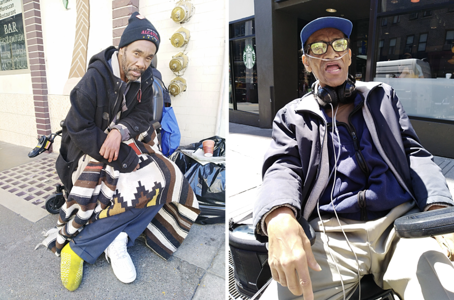 Tony rechts fuhr mit seinem Scooter und seiner COPD-Maske meistens singend durch die Straßen. Bei unserer ersten Begegnung fragte er mich plötzlich in rasantem Überholvorgang von der Seite, wohin ich denn wolle und, ob ich denn zufällig zwei Millionen Dollar für ihn übrighabe. Bis zum Eingang von Chinatown hatte ich ihn auf 5 Bucks heruntergehandelt. Er nahm das gerne lachend hin. Wir trafen uns immer wieder und ich erzählte ihm, der ursprünglich aus Cincinatti hierhin gekommen und gestrandet war und einen Schlafplatz in einem HPS, einem homeless people shelter hatte von dem Grund meiner Reise in die Tenderloin, meinen beiden Söhnen hier. Als ich ihm mehr davon erzählte, sah ich hinter seinen dicken Brillengläsern Tränen. Vielleicht hatte er ähnliche Dinge erlebt. Großartige Menschen. Viele bewegende Geschichten. Einmal warnte Tony mich vor einem weißen Obdachlosen, der offenkundig auf Meth oder einer anderen synthetischen Droge war. Auch die Latinos und Chinesen und andere Ostasiaten waren in Gruppen auf der Straße recht gut organisiert. Aber einmal mehr waren es afro—amerikanische Freunde, die am zugänglichsten waren. Sie, die nach den indigenen Bewohnern des nordamerikanischen Kontinents am längsten dort waren, die Blues, Soul, Gospel, Rap und Hiphop und mehr kreiert hatten. Die in Häusern lebten, die andere, vorwiegend Weiße „Broken homes“ nannten, wie Gil Scott-Heron sagt, die aber täglich hart dafür arbeiteten, für und an ihren Leben und ihren Behausungen.