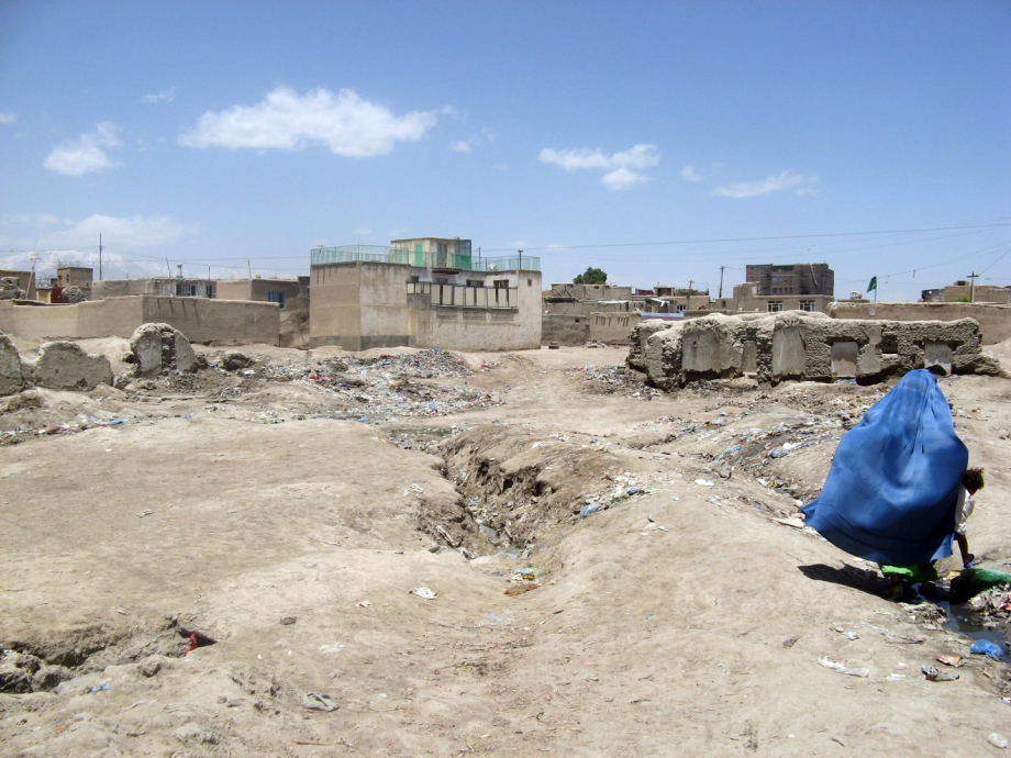 Das Foto hier von Ende Mai 2009 aus Asheqan wa Arefan, dem südöstlich des Kreuzungspunktes der Altstadt von Kabul gelegenen Viertel zeigt viele Aspekte des Dilemmas eines solchen Ortes als Post-Konflikt-Ort ohne Übergangsmöglichkeit in eine wirkliche Transformation und Nachkriegszeit. Kriegszerstörung vorwiegend aus den verschiedenen Phasen des Bürgerkriegs 1991-1996, verschüttete Grundstücksgrenzen und damit Eigentumstitel nach damals 30 Jahren offenem Konflikt. Also nach 1979, der Invasion der Sowjets. Die Erosion recht nahe am Flussbett zeigt aber auch die völlige Zerstörung von Infrastrukturen und die Schutzlosigkeit der Bewohner dort. Diese wird nochmals versinnbildlicht durch das Kind, das Zuflucht vor der gleißenden Sonne im zerstörten engen Gassengeviert unter der im heißen Wind wehenden Burka der Mutter sucht. Auch die zusätzlich durch den Migrationsdruck, Übernutzung und (zumeist illegale) Brunnenbohrungen verstärkte Wasserarmut deutet sich hier an.