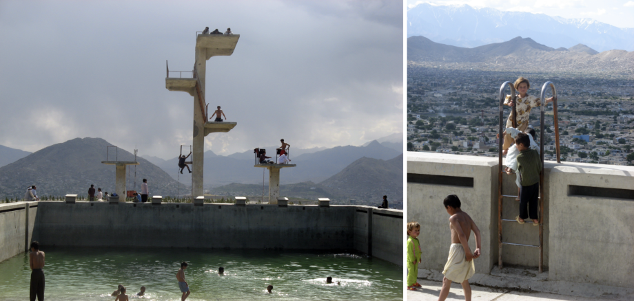 Zur Machtdarstellung der Großmächte des Kalten Krieges in Stadtraum und Stadtgefüge Kabuls gibt es manche bemerkenswerten Punkte. Hier das kurz nach der Invasion aus Anlass der vom Westen boykottierten olympischen Spiele in Moskau 1980 von den Sowjets gebaute 50-m Schwimmbecken auf dem Bibi Mahroon Hügelplateau, das sich rund 70m über dem Talniveau der Stadt auf rund 1800m ü. NHN erhebt. Der 10m Sprungturm ist insofern weithin sichtbar. Beim Bau hatte man das Thema, dass Wasser nur mit komplexen Pumpwerken bergauf fließt etwas vernachlässigt. Dennoch: im Juni 2009 war zumindest der Sprungbereich mit zweifelsohne nicht ganz Badewasserqualität erreichendem kühlendem Nass befüllt. Auch ein Bademeister nach deutschem Standard war nicht zu sehen. Viele Kinder, zumal viele der Kriegswaisen in den Heimen der Stadt darunter hatten so einen Spielplatz gefunden, bei dem sie auch relativ selbständig schwimmen lernen konnten und zudem im grünen Nass reich shampoonierter Körperhygiene frönen konnten. Zum exponierten Plateau des Sprungturms geht das Gerücht, dass die sowjetischen Besatzer Verräter, oder solche Menschen, die sie dafür hielten vorne auf den Sprungturm stellten und dann von der Leiter aus exekutierten, sodass der Körper dann rund 14m tief