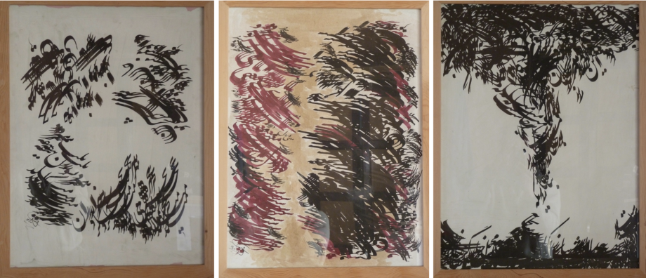 Die drei Kalligraphien hier hatte ich im Frühjahr 2009 in Kabul von einem Hazara, einem Schiiten also aus dem Hazaragat, dem „Herzen Afghanistans“ mit dem Künstlernamen Ali Baba Orang gekauft. Pinselstrich und alles Weitere erinnerte mich an Jackson Pollock und andere sehr frei agierende, eher im weitesten Sinne abstrakte Künstler. Ein befreundeter Schriftsteller, der Brite Paul Pickering hatte ja auch in seiner Adaption des Zauberers von Oz auf das westliche Besatzungsgeschehen in Afghanistan „Over the Rainbow“ 2012 den bemerkenswerten Satz geprägt: