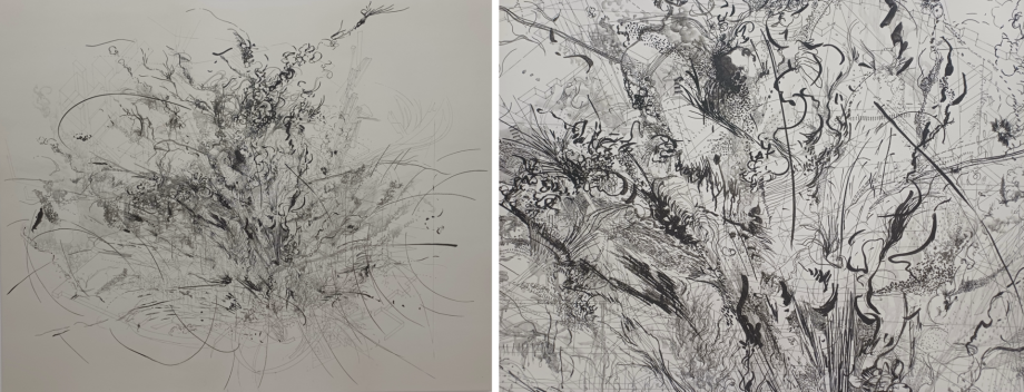 Auf der linken Seite ist die „Nadelöhrkalligraphie“. Weniger ungestüm als die alles verwirbelnde Tornadokalligraphie – aber auch mit einer tiefen Eigendynamik, die in ihrer Zentriertheit und Symmetrie sehr viel mehr Ruhe ausstrahlt als die alles verwirbelnde und in einen tiefen Schlund am Bodensatz des Bildes herniederreißende Tornadokalligraphie. Auch hier ist es