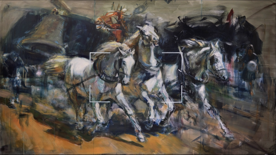 Ali Baba Orangs Kalligraphien vielleicht in einem feuchten Keller in Kabul, vielleicht gebrandschatzt und zerstört: Ein Druck der 180x320cm messenden, mit Acryl bemalten Leinwand „Die Pferde“ von einem meiner besten Freunde hängt jetzt hier in der Küche. Als Walter Padao das Bild in der Pandemie 2020/21 hier in seinem Atelier malte, da sinnierten wir öfters gemeinsam davor. Die große Glocke links hinten, die ausbrechenden drei weißen Pferde vorne: „For whom the Bell Tolls“ – „Wem die Stunde schlägt“ von Hemingway war meine erste komplette (Schul-) Englischlektüre seinerzeit gewesen. Der rote Pferdekopf dahinter, die Scheuklappen, der schwarze Hintergrund, grauer Rand, verstaubter Horizont im Einerlei des aufgewirbelten Drecks, Vergangenheit, Gegenwart, Galopp und Ausbruch in welche Zukunft auch immer, Bedrohungen und Verheißungen: es gibt fundamentale Unterschiede in Walters und meinen Denkweisen. Freundschaft und Demokratie müssen das aushalten. Letztlich markiert das scharfkantige Sucherrechteck in der Bildmitte nur einen möglichen Fokus.
