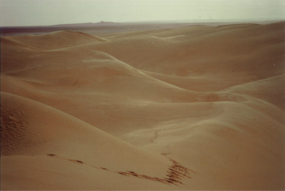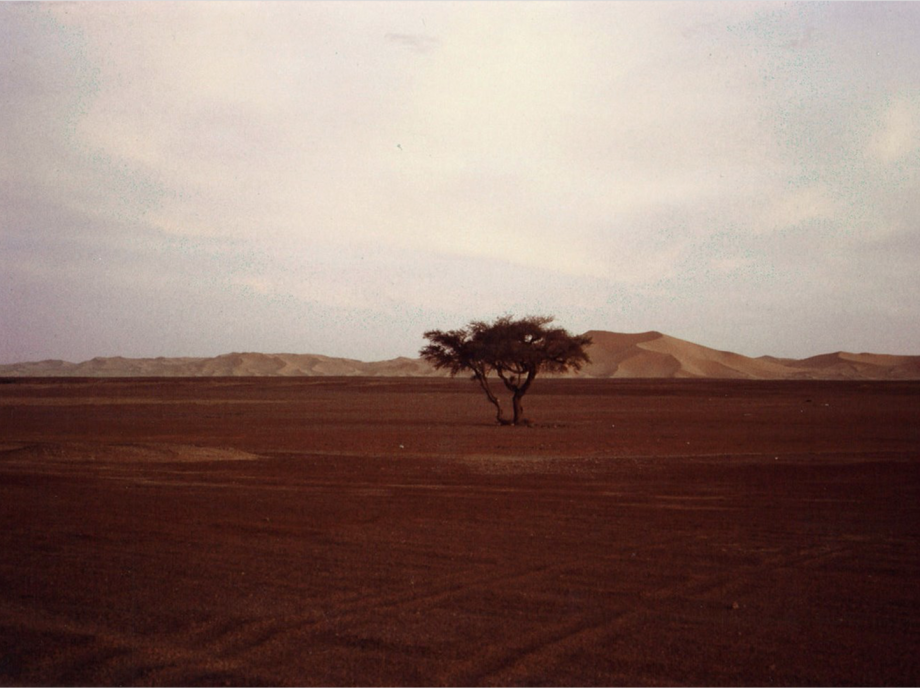 Auf der Strecke zwischen Timimoun und Béni Abbès, wo Bernardo Bertolucci auch 1990 den „Himmel über der Wüste“ mit der großartigen Kameraarbeit von Vittorio Storaro drehte, fanden Miloud und ich uns 1986 spät nachmittags irgendwann an einer Wegbiegung ca. 80 km vor unserem Zielort wieder. Kurz vor Sonnenuntergang kamen fünf LKW’s, die immer im Convoy wegen Wüstenräubern zudem feindlich gesinnter Stämme und anderer Unwägbarkeiten fuhren. Natürlich nahmen die Kollegen uns mit und teilten auch später das Abendessen mit uns. Es war ihnen und uns eine Ehre. Am Morgen, nach dem Schlafen auf dem Wüstenboden hatte ich dieses Bild vor mir. Auch in Wüsten gibt es weitaus mehr Leben als es jedem Mitteleuropäer auch nur annähernd bewusst ist. „Die Wüste wächst: weh dem, der Wüsten birgt…“, wie Friedrich Nietzsche in seinen Dionysos Dithyramben sagt.