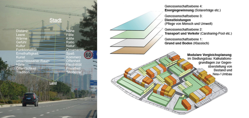Bilder: Stadt-Land-Bezüge vor dem Hintergrund einer neuen Stadtplanung in „Chinas europäischen Osten“ – Schemenskizzen zu den Themen „Neuformation von Genossenschaften“ und „modulare Wohnraumerstellung“ im kleinteiligen Siedlungsformat.